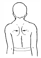 1. Tumbada sobre la espalda, con los brazos estirados a lo largo del cuerpo. 2. Acerque sus omóplatos (“paletillas”) como se ve en la figura. 3. Mantenga la posición cinco segundos y luego relájese. 4. Repita el ejercicio cinco veces. |