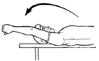 1. Tumbada sobre la espalda, sujete el codo del brazo afectado con la otra mano como se ve en la figura. 2. Tire del codo y mantenga la postura durante cinco segundos, luego relájese. 3. Repita el ejercicio cinco veces. |