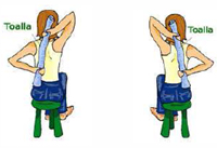 | Sentada sobre un taburete, sujete una toalla por la espalda, con una mano por arriba y otra por debajo, realice movimientos hacia arriba y hacia abajo. |