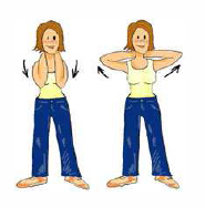 | Coloque ambas manos entrecruzadas en la nuca, junte los codos delante y luego sepárelos al máximo sin soltar las manos. |