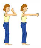 | Con los brazos extendidos hacia delante, a la altura de los hombros, flexione los codos a la vez que cierra el puño. Posteriormente estire el brazo a la vez que abre las manos. |
